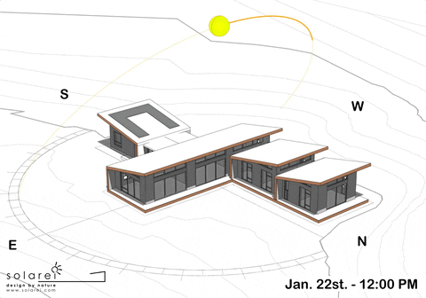 Solarei have put together this animation below showing the extent of the 12pm sun path throughout the year. The house design is the Coatesville Passive Solar House by Solarei.